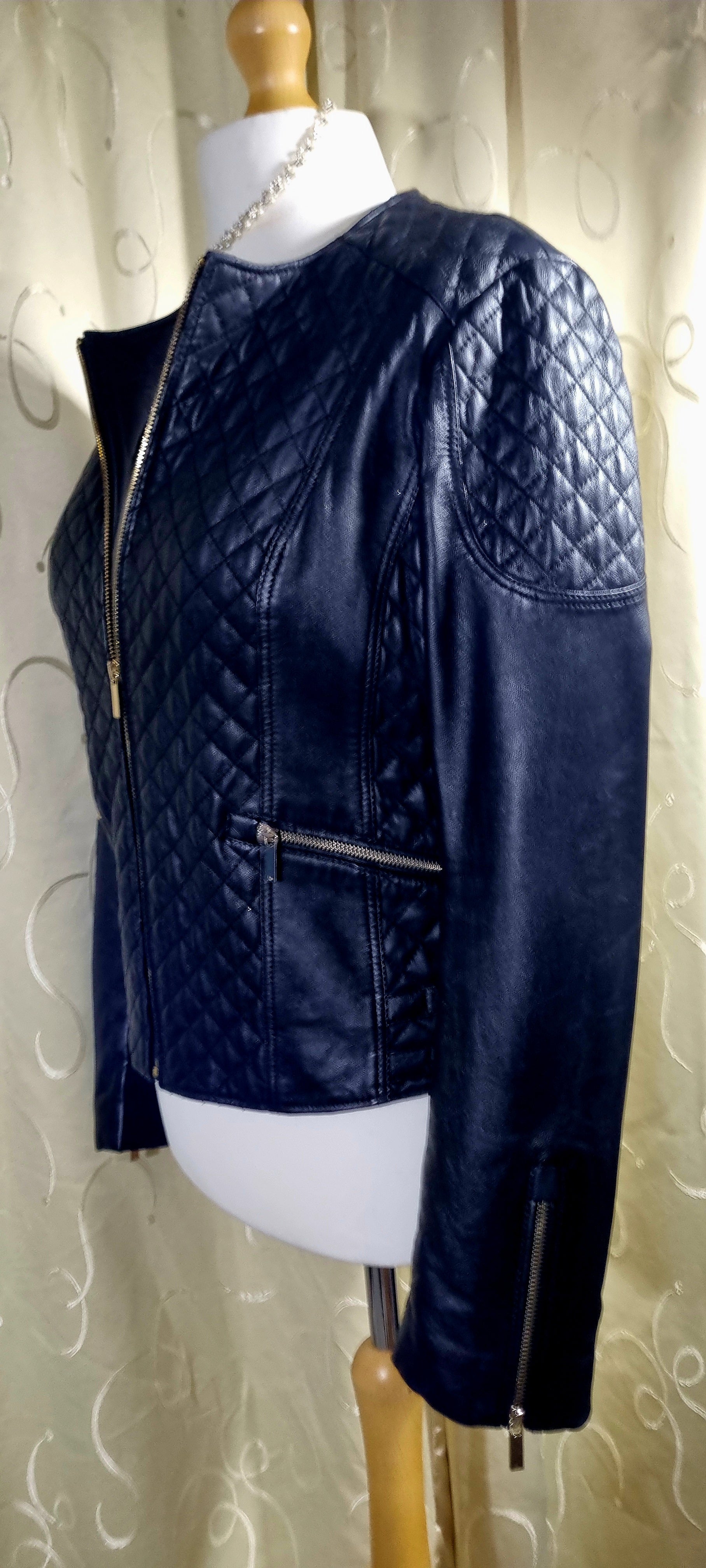 Karen Millen genuine leather jacket featuring a quilted design with zip fastening and multiple zip pockets. A beautifully tailored fit that combines luxury with edgy sophistication — perfect for both casual and dressy looks.
