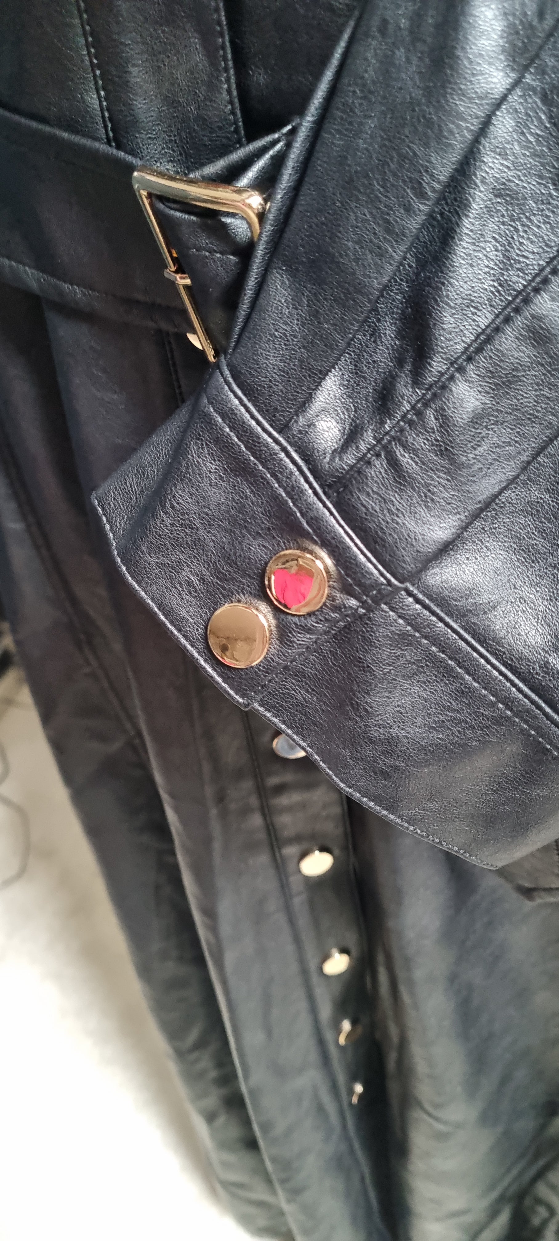 Slip into this chic Karen Millen faux leather shirt dress and turn heads wherever you go. Designed in a flattering size 22 with real pockets and a stylish belt, it combines comfort with effortless style. The long sleeves and gold details add a touch of luxe, making it perfect for day-to-night wear. Worn only a handful of times, it looks as fresh as the day the tags came off! Whether you're dressing up or keeping it casual, this dress is ready to elevate your wardrobe with playful sophistication.