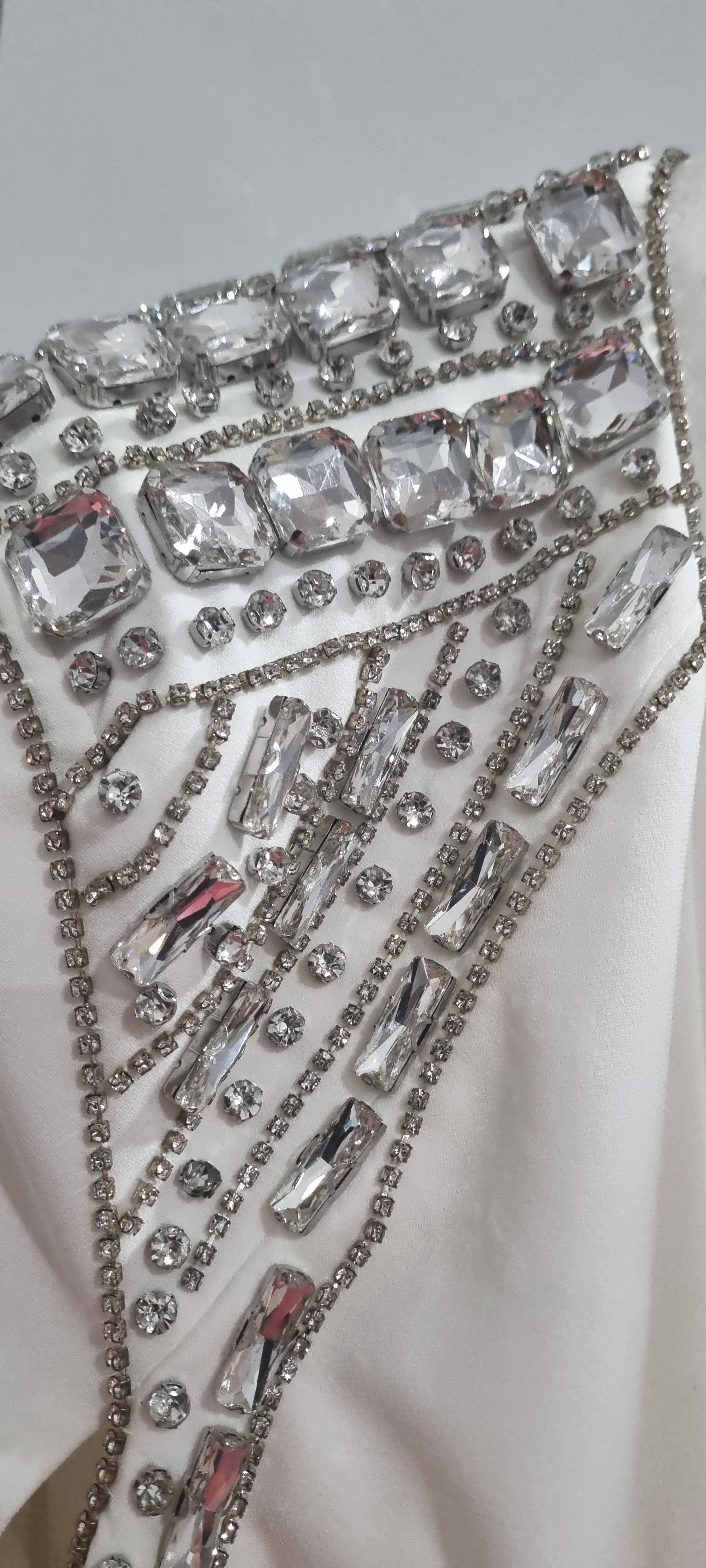 Intricate silver bead and crystal embellishments across shoulders, neckline, and waistline