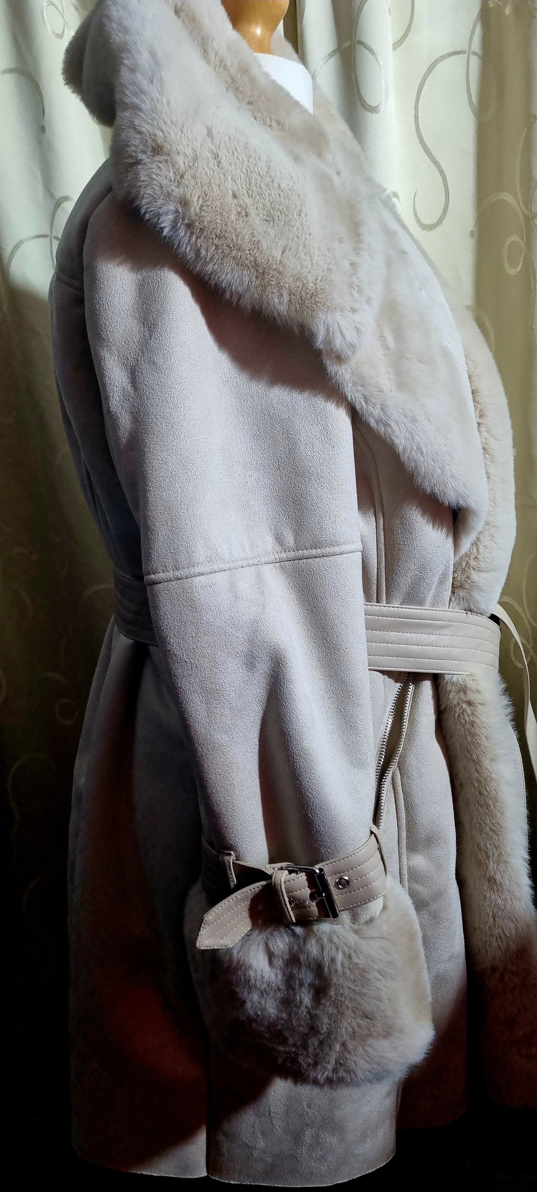 Beautifully designed in a soft cream shade, it features a fully faux-fur lining, large plush collar, belted waist, and zip detail sleeves and pockets for a sophisticated finish.