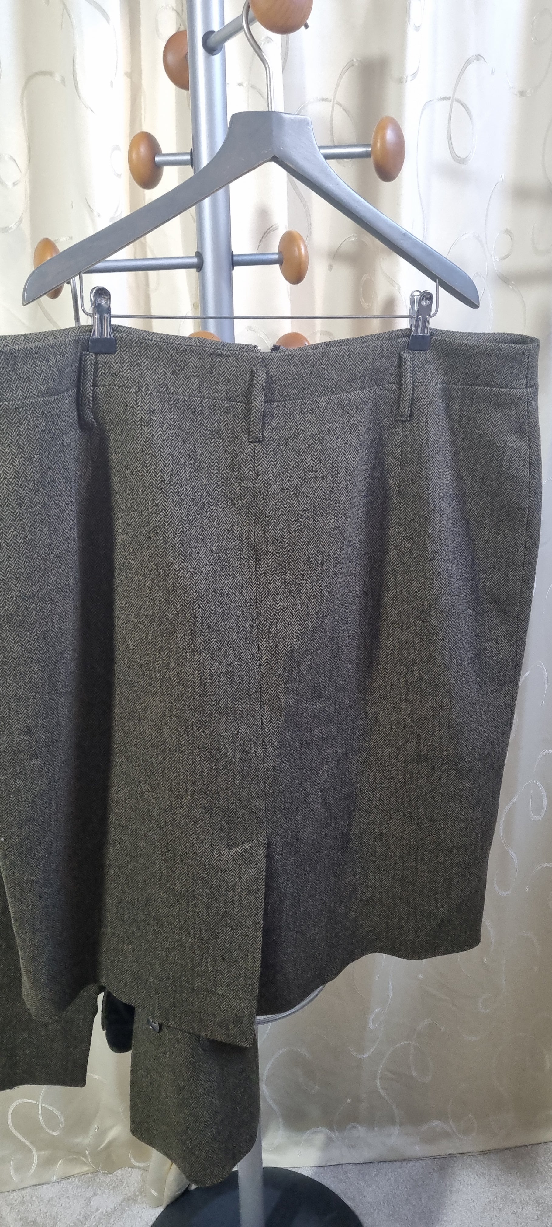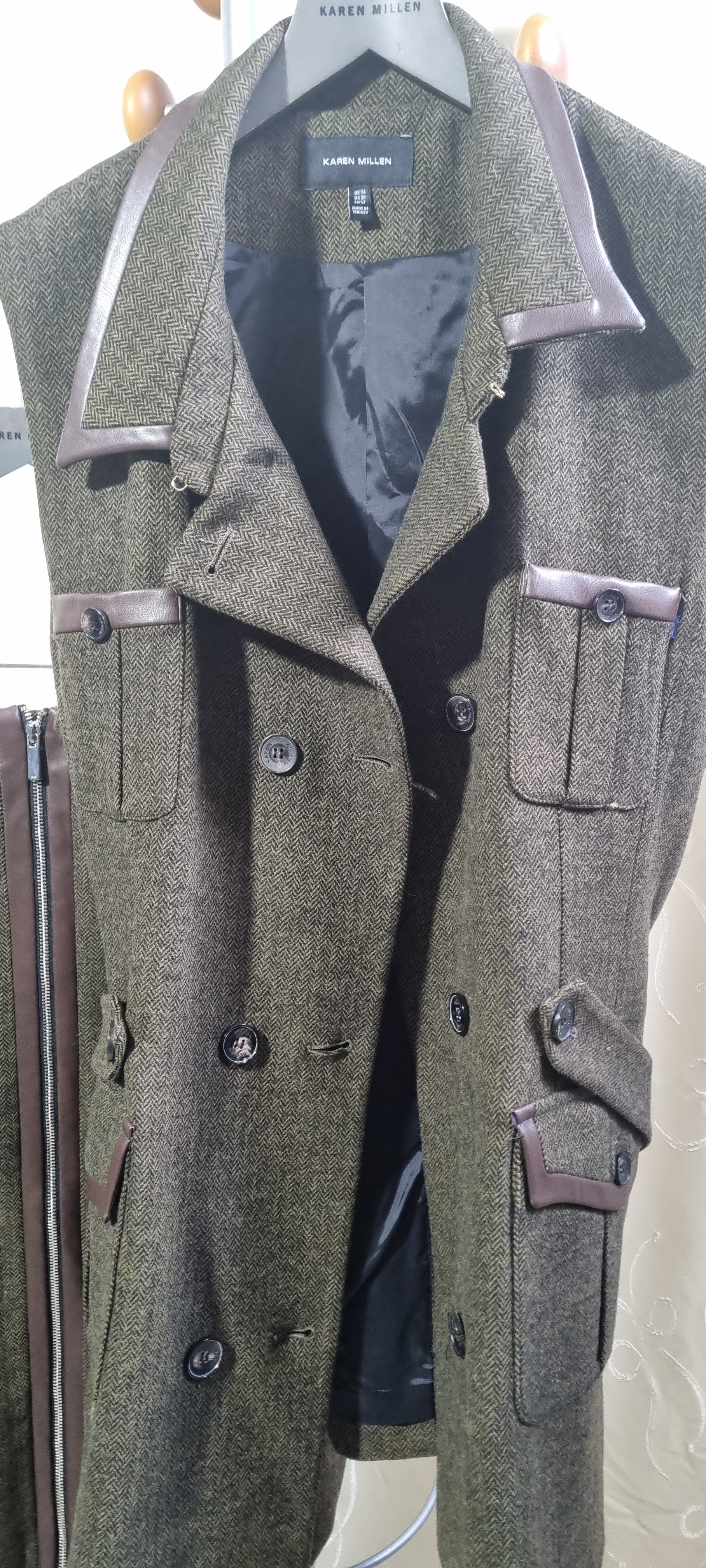 Crafted from premium herringbone tweed in a rich olive tone, this beautifully tailored ensemble features chic leather-look trim, multiple statement pockets, and classic button detailing.